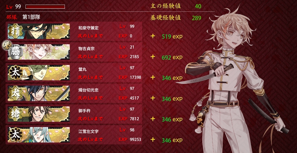 あとは5-3組(平均lv90)と短刀(lv97)と新規組だけ!