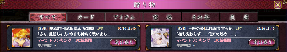 報酬枠がいろいろで緩んで150位以内になったし、シンゲンもう一枚とケンシン1枚貰えそう^^