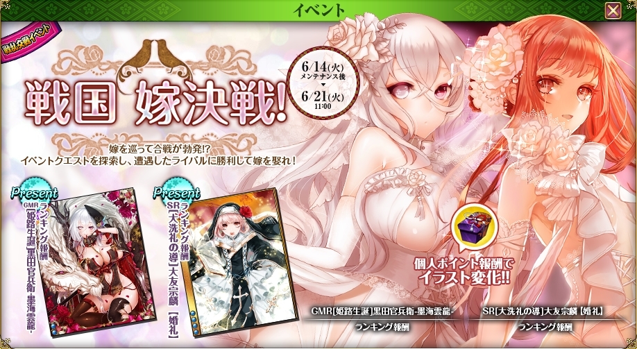 黒田ちゃんの花嫁イベきたけど、報酬が25位以内とかいうでたらめさなのでさくっと諦め。