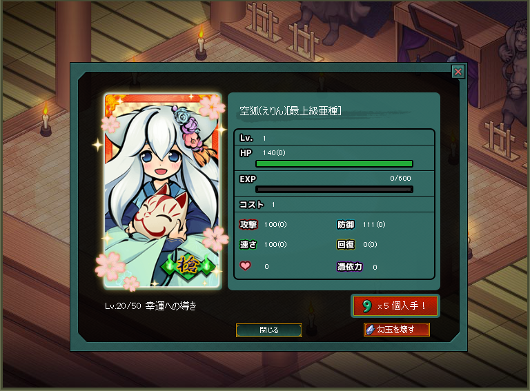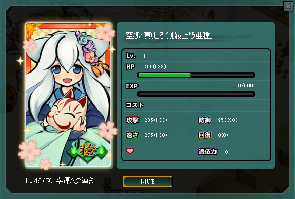 通常空狐もフルカンにしたいけど、そろそろ真実装されそうな気もしてるし、特くー使ってて使えてないから、後にするかなぁ。
