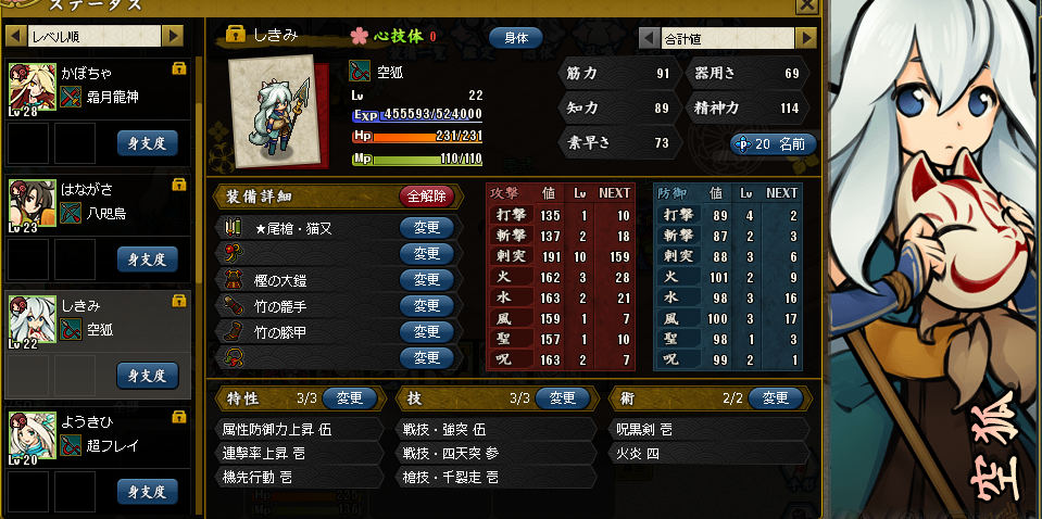 盾の特龍神は玉鋼と刃金、超フレイが直前に買った刃金、武器は☆九尾と★猫又と☆小狐で弓だけしょぼいまま^^;