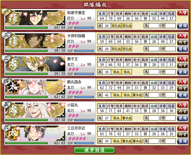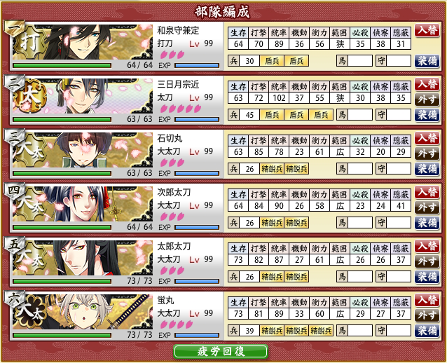 短刀さんズ育成しようかと思ったけど、lv54の脇打太槍勢(+99兼さん+95太槍)でE4周回可能だったので、結局E4周回中!