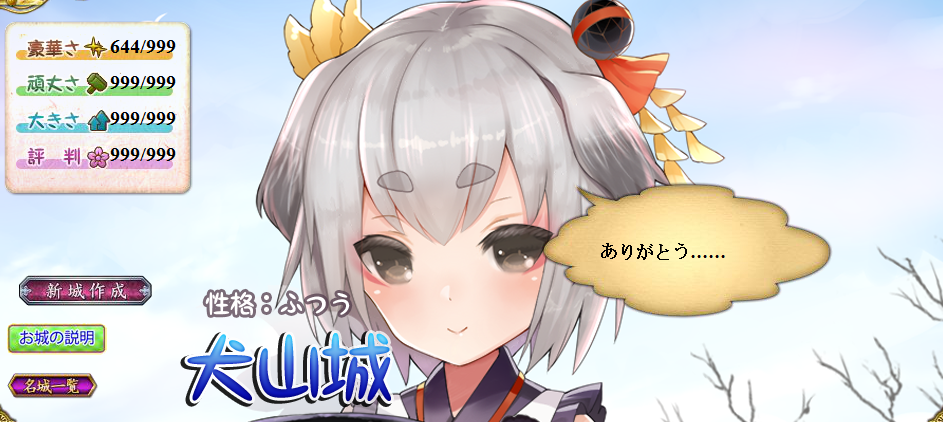大阪ルートで大阪と同じ全カンストで失敗して大阪、今回は一応ヒントで豪華は低め?って感じだったので、築城条件のほぼ最低値にして他カンストで犬山…orz