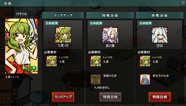 基本種×基本種×物の怪=上級種なんで簡単ではあるんですけど、これの合成確率アップのための物の怪の数が足りん^^;