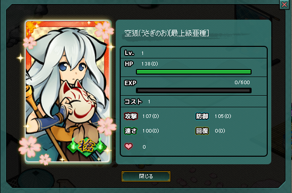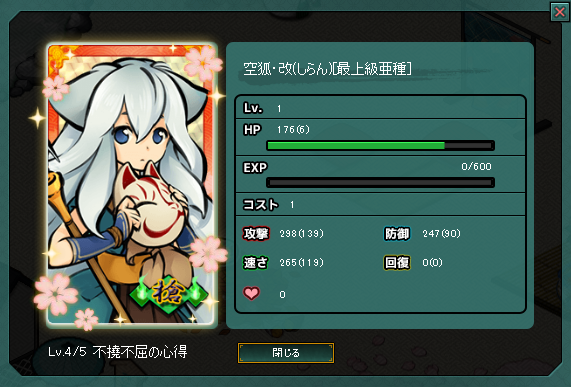 素材になって消えた空狐ちゃん(うさぎのお)とのステの差が凄いのは、基本ステ以外でステ強化できる五行の強化済だからです。