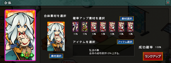 確率アップ用レア姫2体+上5体+アイテム1個で100%成功。