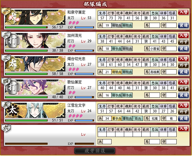 レシピは隊長も重要みたいだけど、一番強い兼さんでそれなり出るから放置。
