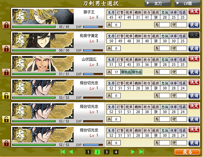 4-1開始時だと、蛍太郎をレベ20前後で突っ込んでるし、刀装も特は一人1個あるかどうかで騎歩のみ。