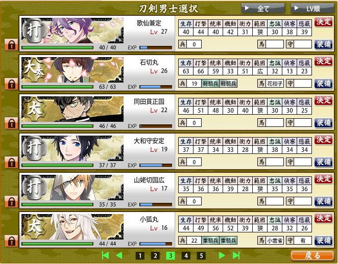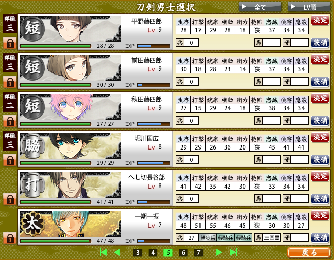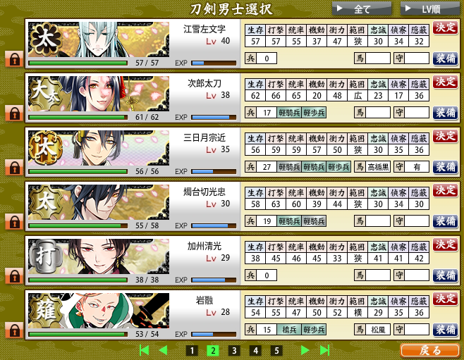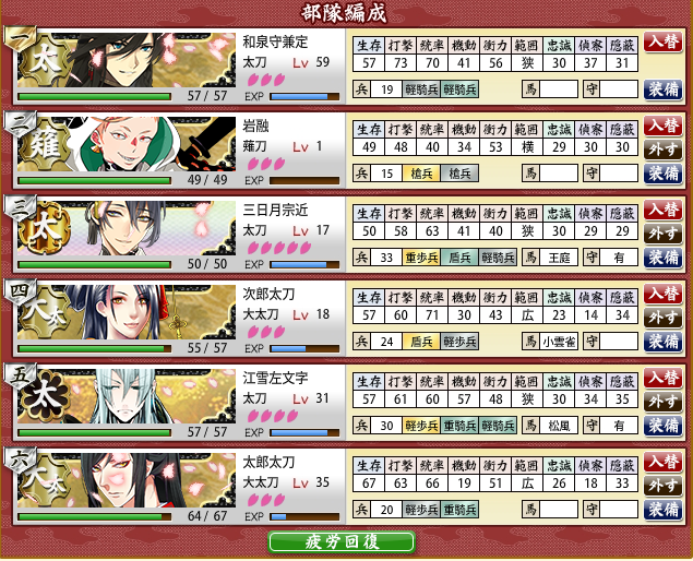 とりあえずlv40まで育ったら隊から外すってして順に育ててきたけど、一期さんがきて、lv38で次郎さんが入らなくなっちゃった~^^;