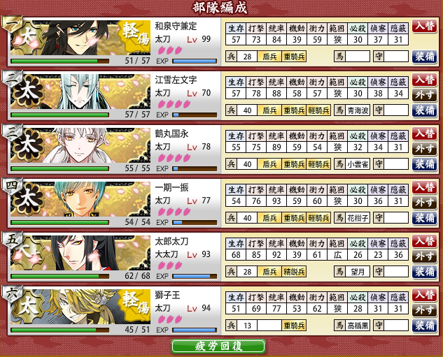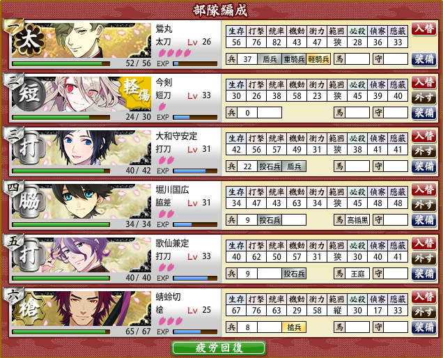 今回は刀装は壊されてないけど(集中攻撃なかった)軽傷→手入れ→手伝い札の消費が地味に心配。
