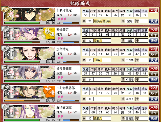 2回目検非違使は真ん中(統率)有利で刀装も無事で勝利Aで一人軽傷かな?