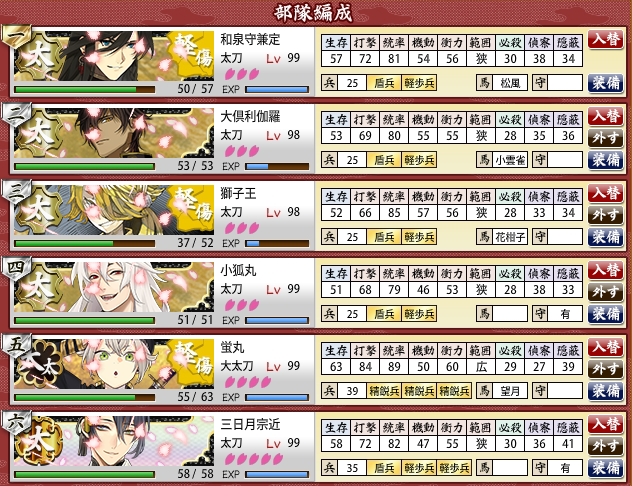 lv99兼さん隊長lv22短2本lv53lv56脇2本lv43?短1本 で池田屋。