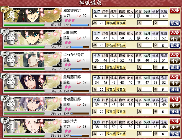 脇打だと短刀より統率体力は安心だけど、一撃できない被ダメの方がでかい気もするしなぁ…。