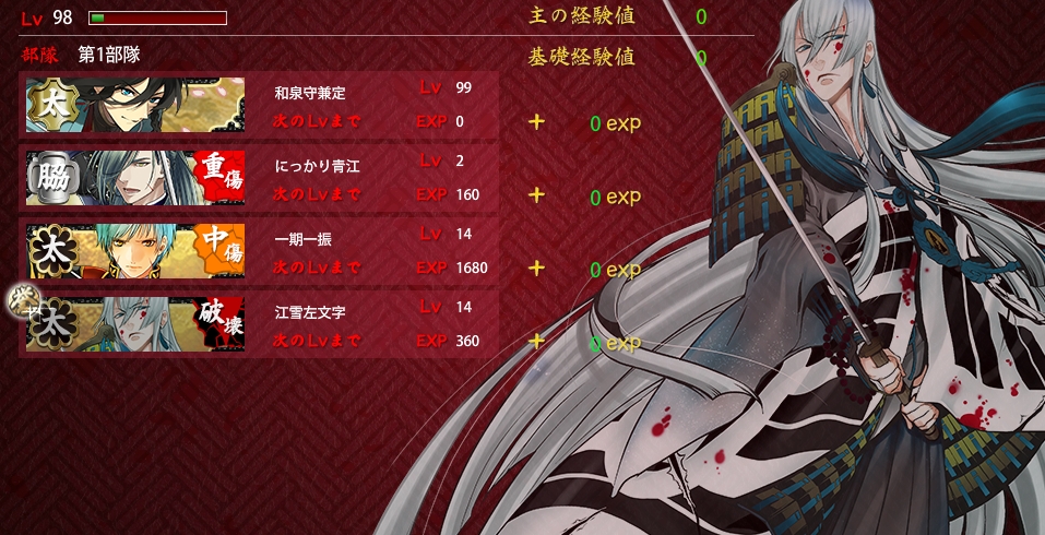 lv40の今剣入れて脇4近侍兼さんで周回しつつレベル上げ。