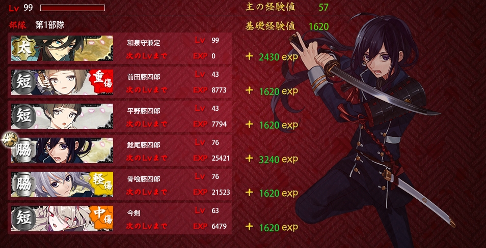 演練と遠征で地味に経験値稼いでた倶利伽羅さん、やっとカンストー!