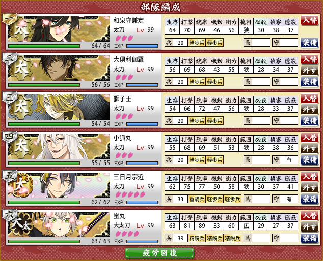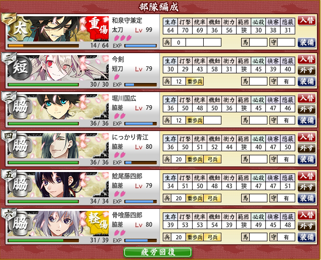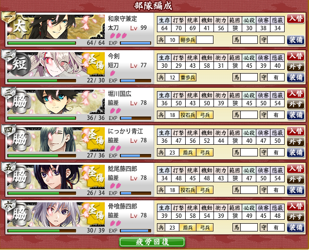 刀装をちょいちょい変えてみてるけど(兵力上げて破損を防ぐ意味で)どうかな~。