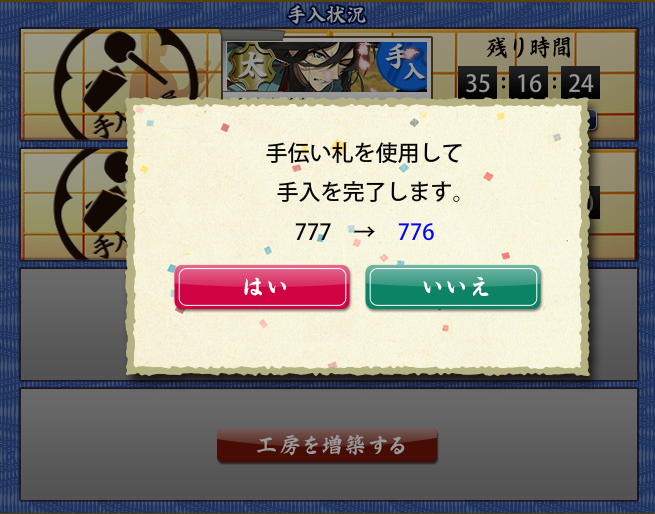 遠征で手伝い札集めして、朝夕夜(遊ばない間)で3h前後の修理を入れとく。