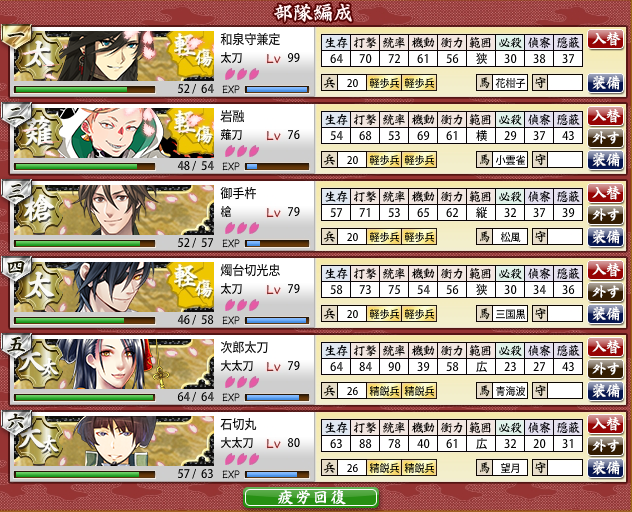 検非違使出るようになってから、軽傷もすぐ手入れしちゃってたし。