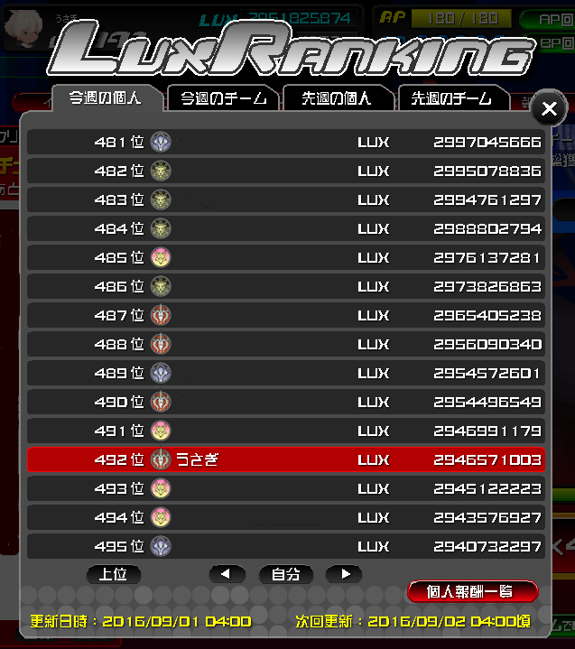 LUX頑張って稼いで、初の500位以内(ぎりぎり)を果たした!