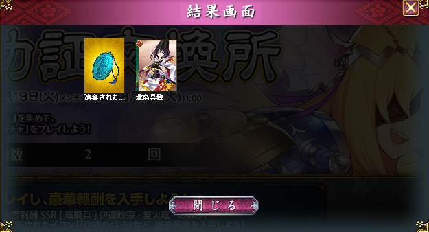 BOXガチャのチケが今回の報酬なんだけど、1%でしか出ないSSR報酬カードが、10枚引きで1枚、その後貯まった1枚で1枚、今日だけで2枚も来た…!