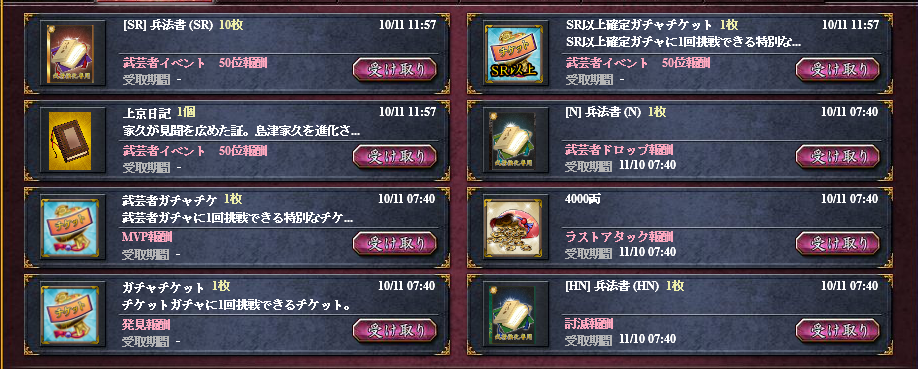 目玉報酬のSSR×2(最大入手3)限定スキル書・限定装備A。