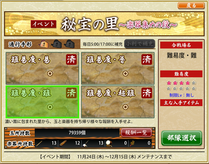 でも全イベ達成しないと極用道具貰えないし、戦闘回数達成できそうにないから、4面と違って埋めることにさほど旨みはないんだけどね^^;