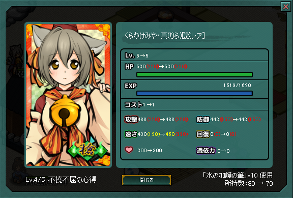 特おゆきさん(旧)は特姫編成の回復で素の子を使ってるんだけど、五行積んでも弱いんだよね^^;