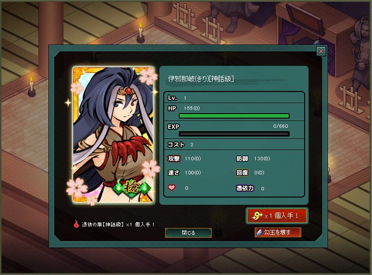神様は、オモイカネとイザナギで2体になったんだけど、弓で槍で属性系統同じなのよね(笑