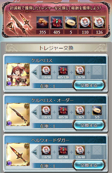武器はあと1個で全カット、交換分確保、ケルベロはこれであと2個!
